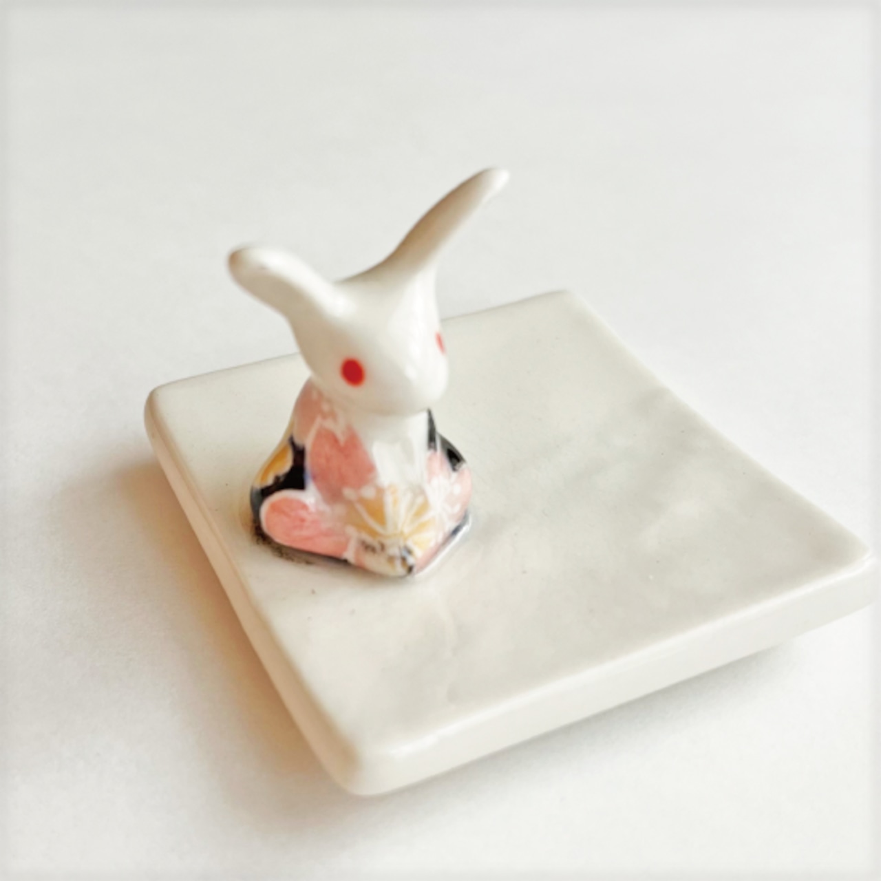 京友禅風の衣装をまとった小さなうさぎがちょこんとお座り。お月見のパーティーやお正月、お雛祭りにもぴったりの箸置き3点セットです。お箸やティースプーンのレストとしてはもちろん、インテリアとして飾ったり、小さなアクセサリーや季節の印香などをちょっと置いても可愛い。